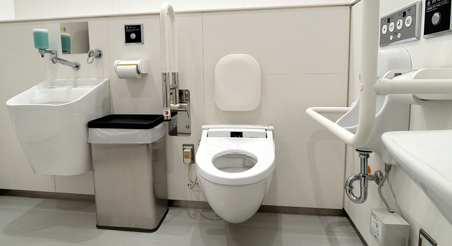 本社当社フロアに、多目的トイレを設置しています。扉は開閉がしやすいスライド方式で、トイレ内部には手すりやオストメイト配慮の設備があります。