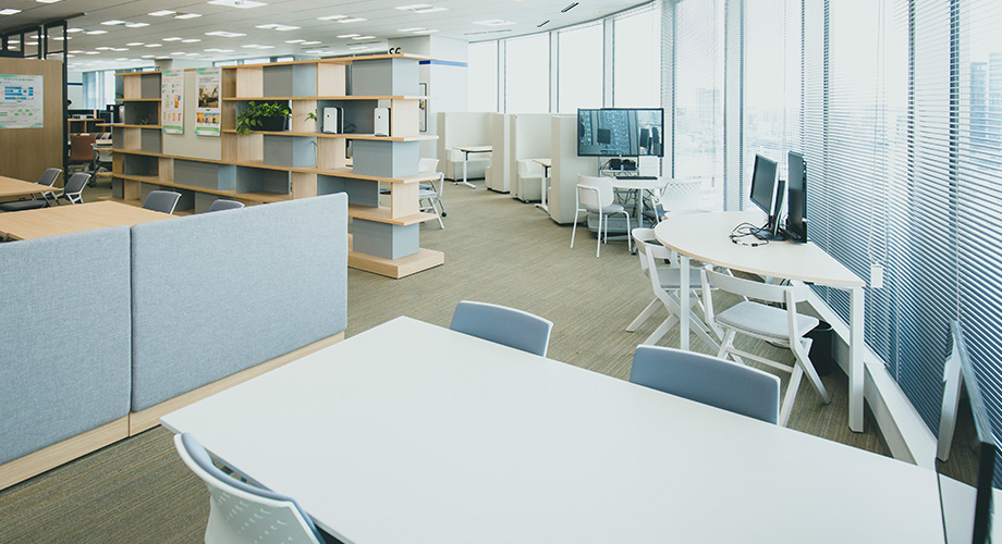 本社当社フロアは、段差のないバリアフリー仕様になっており、車椅子の方もスムーズに移動が可能です。